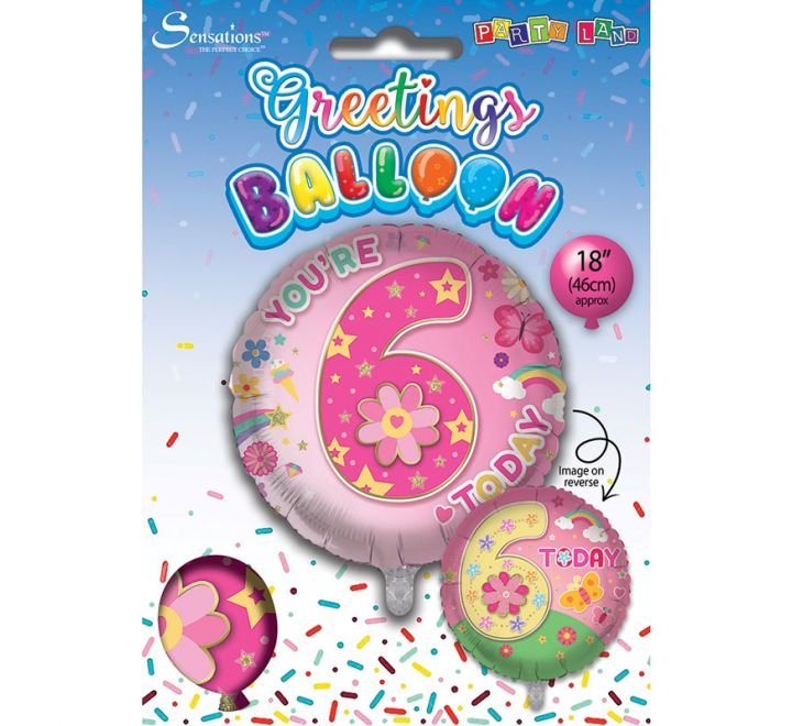 The balloon is adorned with a cheerful message that reads “You’re 6 Today” along with floral imagery, indicating it’s meant for a child who is turning six years old. The floral theme adds a touch of elegance and freshness to the birthday celebration. This type of balloon is commonly used to complement the overall decorative theme of a birthday party, creating a warm and festive atmosphere, especially for a young child’s celebration with a floral theme.